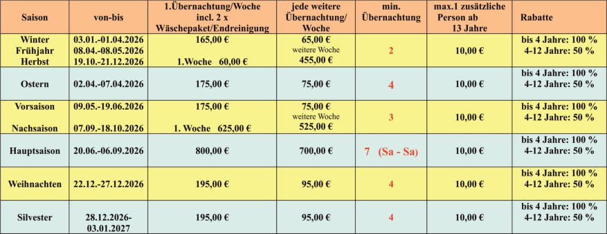 Hauptsaison 01.04. – 31.10. Nebensaison 01.11. – 31.12.